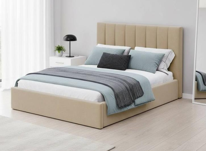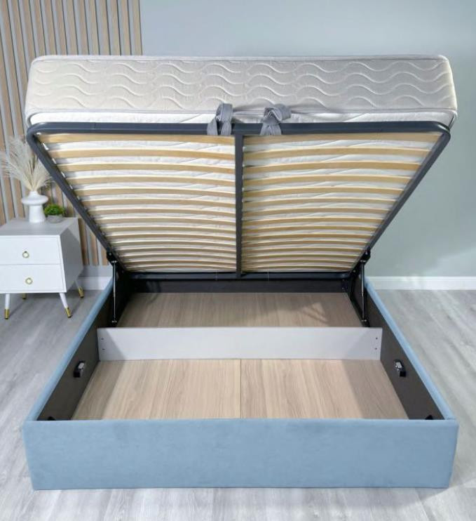 Кровать без ножек, имеет цельное ортопедическое основание с подъемным механизмом и большим бельевым настилом ЛХДФ