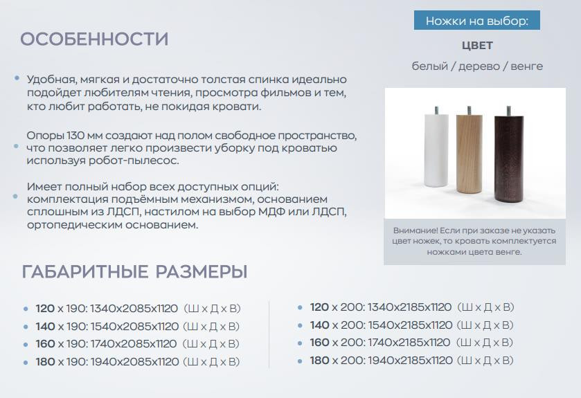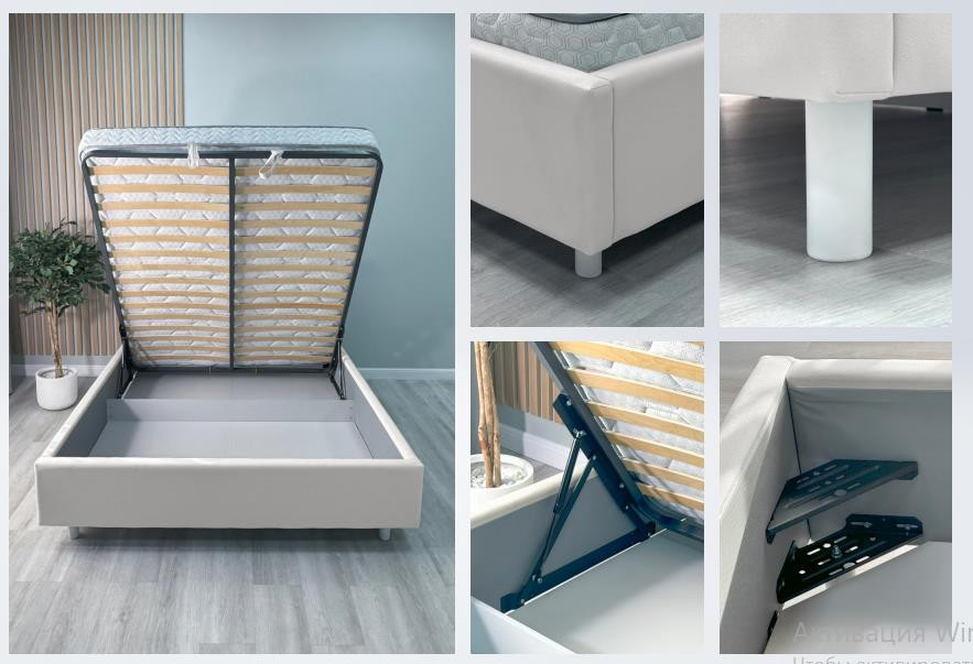 Кровать на ножках, имеет цельное ортопедическое основание с подъемным механизмом и бельевым настилом ЛДСП (на выбор: малый или большой)