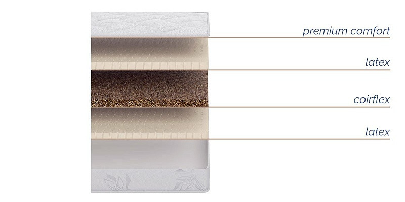 Кокос - пропитанные латексом (латексированные) термоскрепленные плиты. Высокое содержание латекса (50%) обеспечивает материалу упругость и устойчивость к нагрузкам. Экологичность, природная эластичность и хорошая воздухопроницаемость плит из кокосового волокна делают поверхность матраса жесткой и упругой. Благодаря жесткости кокоса, матрас обладает высокими ортопедическими свойствами.